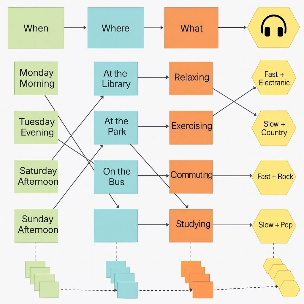 This study proposes a context-aware music recommendation framework based on four semantic features—Who, When, Where, and What (4W)—to better reflect users’ real-life listening behaviour. While existing streaming platforms prioritise collaborative filtering or artist/genre similarity, they often fail to capture the situational factors that shape personal music preferences. To address this limitation, this research analyses user-specific lifestyle patterns over a four-week period and constructs three recommendation modesSongs of the Week, Songs of the Day, and Songs of the Time—each utilising progressively more granular behavioural data.
